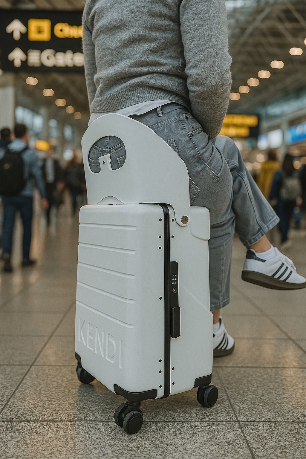 A PREMIUM CABIN SUITCASE WITH AN INTEGRATED SEAT. COMFORT DURING QUEUES. CONTROL THROUGH TERMINALS.BUILT FOR FAMILIES WHO TRAVEL OFTEN.