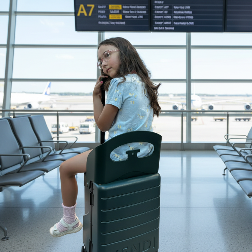 Kendi is a premium high end ride on cabin suitcase with built in seat for kids and adults made of durable materials and aluminium frame, designed for family and everyday travel. It features an integrated seat that allows adults and children to rest during airport queues, reducing fatigue and the need to carry tired children. Designed in the UK, Kendi improves comfort, control, and ease of movement through terminals.